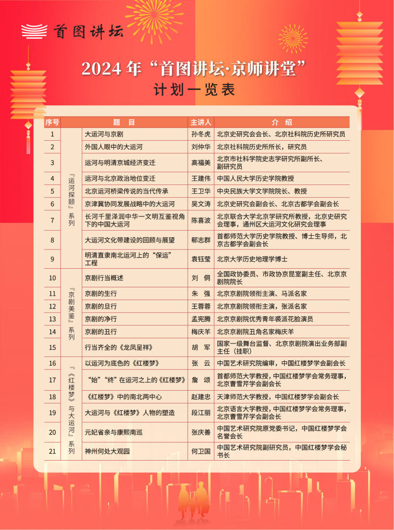 北京史研究會會長孫冬虎發(fā)布“京師講堂”2024年度主題講座計劃。全年近50場講座,包括北京胡同四合院、三山五園、明清北京商業(yè)、龍年說龍等歷史文化與社會生活主題,還有四項專題系列講座——“運河探頤”系列將以大運河的歷史變遷與運河文化的挖掘、研究、傳承為焦點,展示北京城市發(fā)展與大運河的密切關(guān)系;“京劇美鑒”系列致力于讓聽眾體味京劇國粹的獨特風(fēng)韻與文化價值;“《紅樓夢》與大運河”系列將挖掘《紅樓夢》與世界文化遺產(chǎn)大運河之間的密切關(guān)聯(lián);“清朝宮廷”系列將還原清代宮廷生活的真實場景,提升聽眾關(guān)于清代歷史與文化的準(zhǔn)確認知。