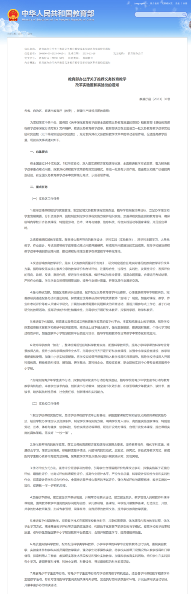 央廣網(wǎng)北京1月8日消息(記者 吳佳怡)近日,教育部辦公廳印發(fā)關(guān)于推薦義務(wù)教育教學(xué)改革實(shí)驗(yàn)區(qū)和實(shí)驗(yàn)校的通知,決定在全國(guó)設(shè)立一批義務(wù)教育教學(xué)改革實(shí)驗(yàn)區(qū)和實(shí)驗(yàn)校,并公示了義務(wù)教育教學(xué)改革實(shí)驗(yàn)區(qū)和實(shí)驗(yàn)校名單。