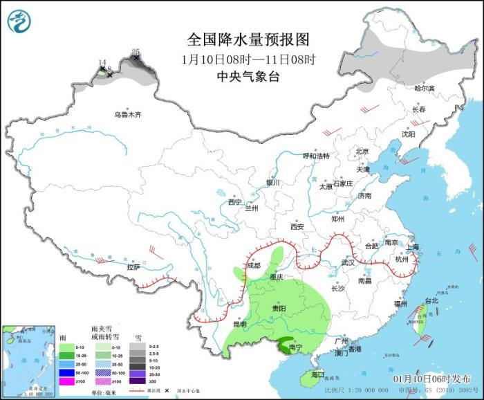 全國(guó)降水量預(yù)報(bào)圖(1月10日08時(shí)-11日08時(shí))