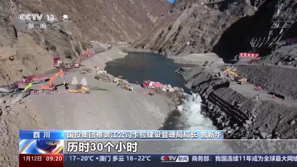國投集團(tuán)雅礱江公司卡拉建設(shè)管理局局長 曾新華:此次截流面對流量大、流速快、龍口水深、河床水位高、場地狹窄等難題。截流過程中,總共拋填石料超過12萬立方米,歷時30個小時。