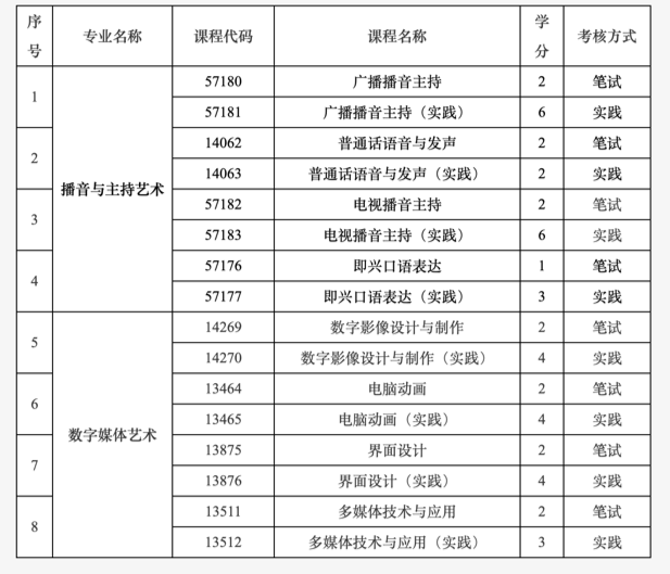 3. 調(diào)整播音與主持藝術(shù)專業(yè)(專升本)、數(shù)字媒體藝術(shù)專業(yè)(專升本)2個(gè)專業(yè)中8門課程(見下表),筆試和實(shí)踐均納入到“非筆試及實(shí)踐類課程”進(jìn)行報(bào)考,由主考學(xué)校組織考試。