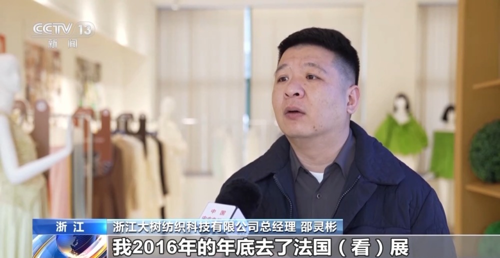 浙江大樹紡織科技有限公司總經(jīng)理 邵靈彬:我2016年的年底去了法國看展,基本上是奢侈品買面料的一個展會。我當時給自己設的一個夢想,10年之內(nèi)我想進展會。