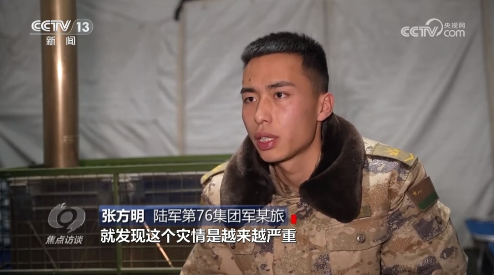 陸軍第76集團軍某旅章新禹:“據(jù)我們了解,他家五間房屋全部開裂,家人在院子里面搭了一個帳篷,我們優(yōu)先讓他回去解決自己的事情,然后再返回部隊。”