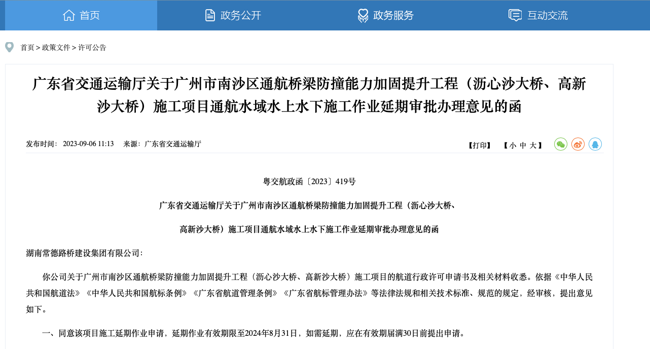 2023年9月,廣東省交通運(yùn)輸廳又發(fā)布瀝心沙大橋、高新沙大橋防撞加固工程延期審批意見(jiàn),文件中稱(chēng)“同意該項(xiàng)目施工延期作業(yè)申請(qǐng),延期作業(yè)有效期限至2024年8月31日”。