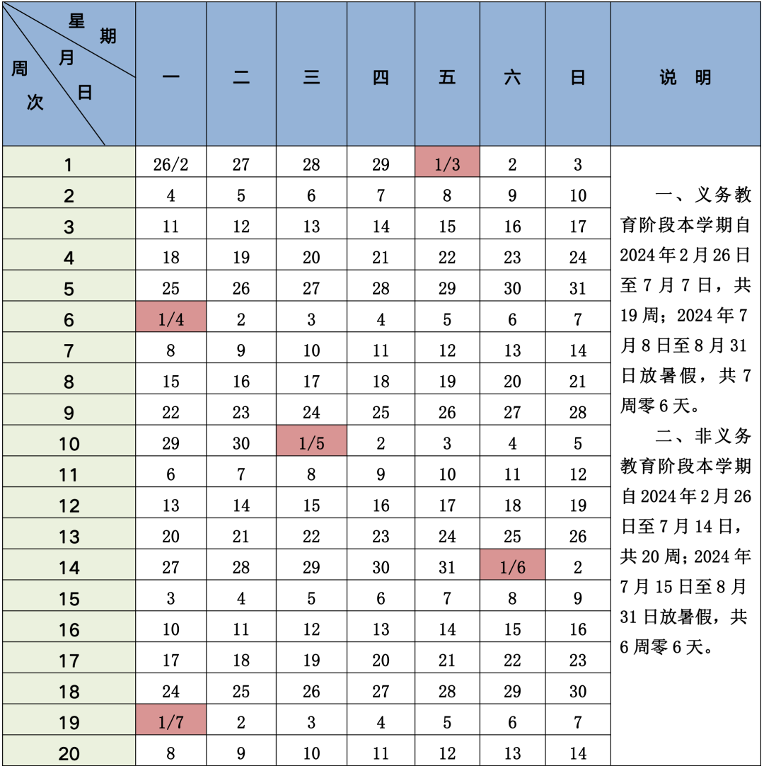 非義務教育階段第二學期于2024年2月26日(星期一)開學;2024年7月14日(星期日)結(jié)束本學期工作,共20周;2024年7月15日(星期一)至8月31日(星期六)放暑假,共6周零6天。