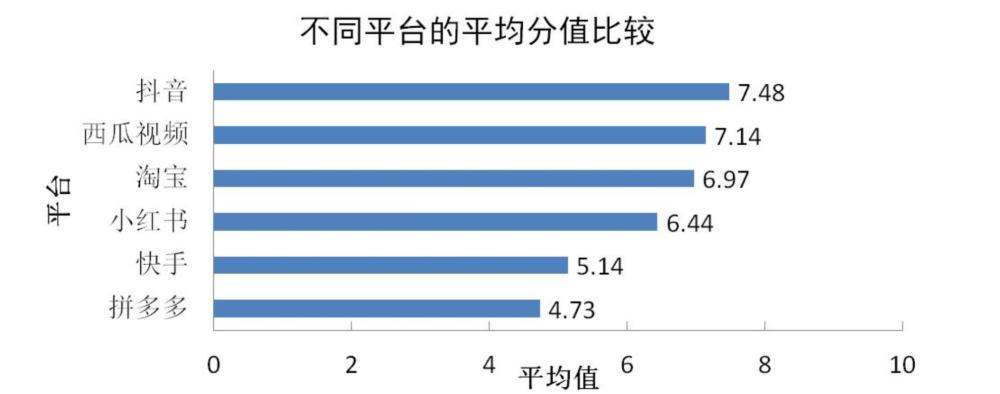 ?、倨脚_比較:本次調(diào)查對買樣數(shù)超過五件的平臺進(jìn)行橫向打分比較,平均得分由高至低分別為:抖音7.48分、西瓜視頻7.14分、淘寶6.97分、小紅書6.44分、快手5.14分、拼多多4.73分。