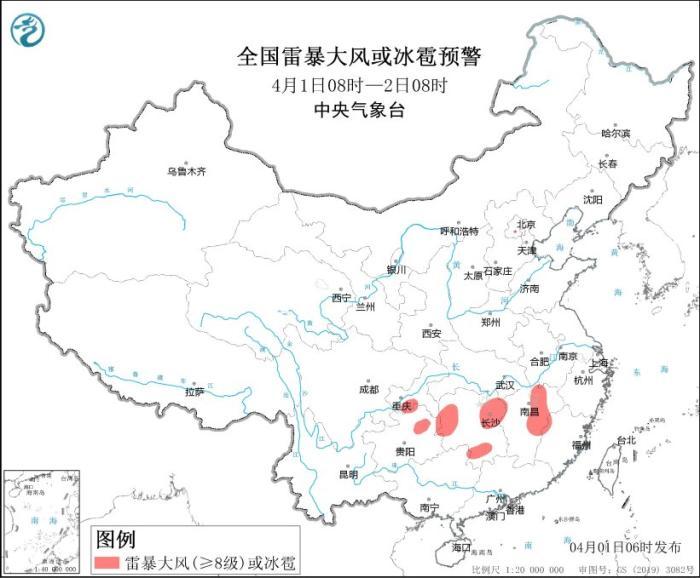 全國(guó)雷暴大風(fēng)或冰雹預(yù)警(4月1日08時(shí)-2日08時(shí))
