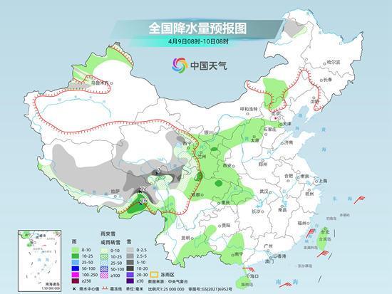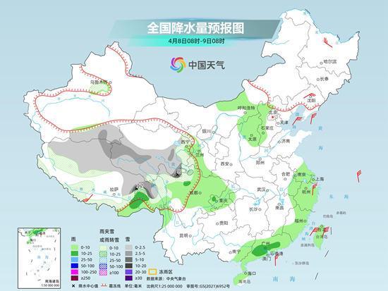 預(yù)計(jì)今天(4月8日),江南、華南等地降雨將明顯減少減弱,迎來降雨間歇期。但在青藏高原中東部,未來三天仍將出現(xiàn)持續(xù)性雨雪天氣。此外,今明兩天,東北、華北等地在冷空氣以及降水的影響下,氣溫將普遍下降。冷空氣過后,上述地區(qū)氣溫又會(huì)快速回升。