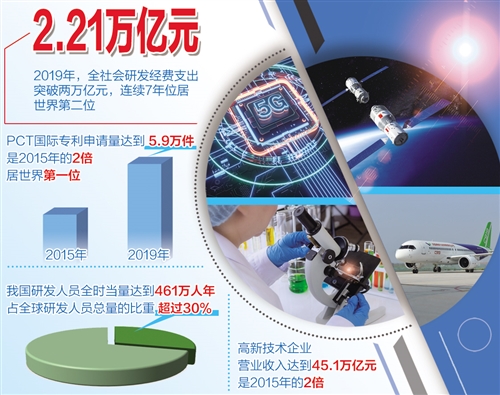 科技創(chuàng)新實力顯著增強。2019年,全社會研發(fā)經(jīng)費支出達到2.21萬億元,是2015年的1.56倍,連續(xù)7年位居世界第二位,占全球研發(fā)經(jīng)費總量的比例超過16%。2019年,PCT國際專利申請量達到5.9萬件,是2015年的2倍,躍居世界第一位。2019年,每萬人有效發(fā)明專利擁有量達到13.3件,提前完成國家“十三五”規(guī)劃目標。