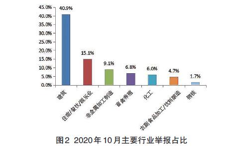 從行業(yè)類型來看,10月公眾反映最集中的行業(yè)為建筑業(yè),占40.9%;其次為住宿餐飲娛樂業(yè)和非金屬加工制造業(yè),分別占15.1%和9.1%。其中,建筑業(yè)占比比9月同類占比增加1.8%;非金屬加工制造業(yè)舉報占比比9月同類占比增加2.1%;住宿餐飲娛樂業(yè)舉報占比比9月同類占比減少0.3%,化工行業(yè)舉報占比比9月同類占比減少2.6%。