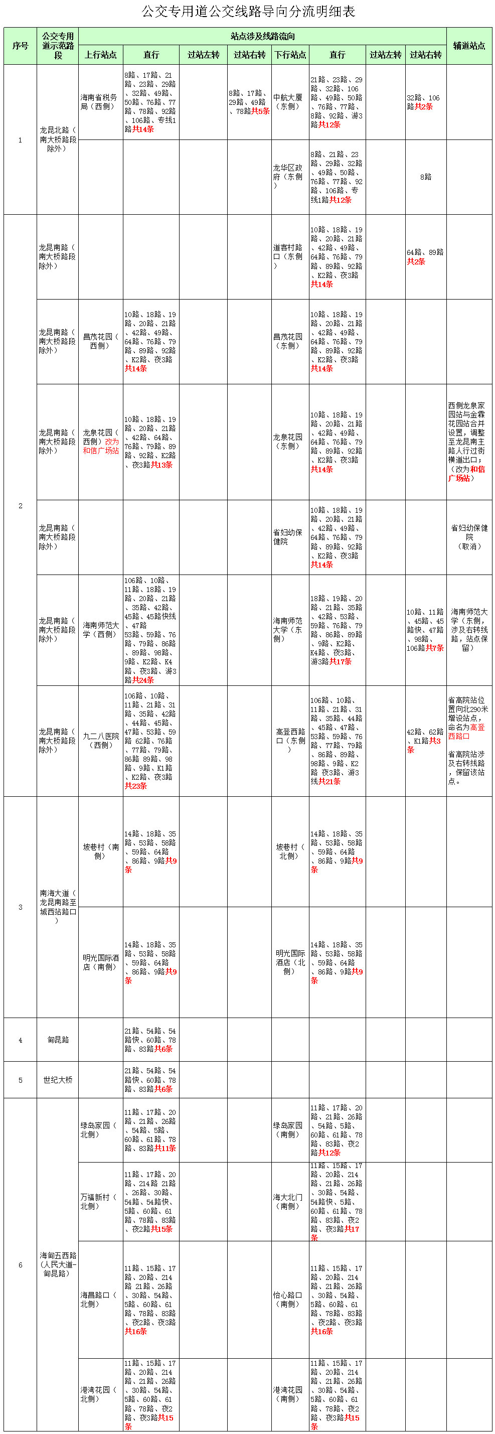公交專用道啟用后,部分公交站點也將做出相應調(diào)整,龍昆南路段道客村公交站北移約50米(保留原站點名稱);昌茂花園公交站(東、西側)兩個站點調(diào)整至龍昆南路主路兩側人行過街橫道出口(保留原站點名稱);東側龍泉家園公交站北移60米并調(diào)整至龍昆南路主路(保留原站點名稱);龍泉家園公交站(西側)與金霖花園公交站合并設置,調(diào)整至龍昆南主路人行過街橫道出口(更名為和信廣場站);省婦幼保健院公交站調(diào)整至龍昆南路主路人行過街橫道出口(保留原站點名稱);海南師范大學公交站北移80米并調(diào)整至龍昆南路主路(保留原站點名稱);省高院站公交站位置向北290米增設站點,命名為高登西街路口公交站,同時調(diào)整至龍昆南路主路人行過街橫道出口。龍昆北路段省國稅局公交站南移約200米,更名為海南省稅務局站;景瑞大廈站遷移至國貿(mào)大道,保留原站名。