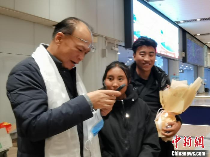 11月14日下午,來自西藏自治區(qū)昌都市的8名脊柱側(cè)彎患者到達北京首都國際機場。圖為北京大學(xué)第一醫(yī)院骨科主任李淳德(左)和藏族女孩澤巴央宗、哥哥貢布鄧珠交談?!⌒煅┈?攝