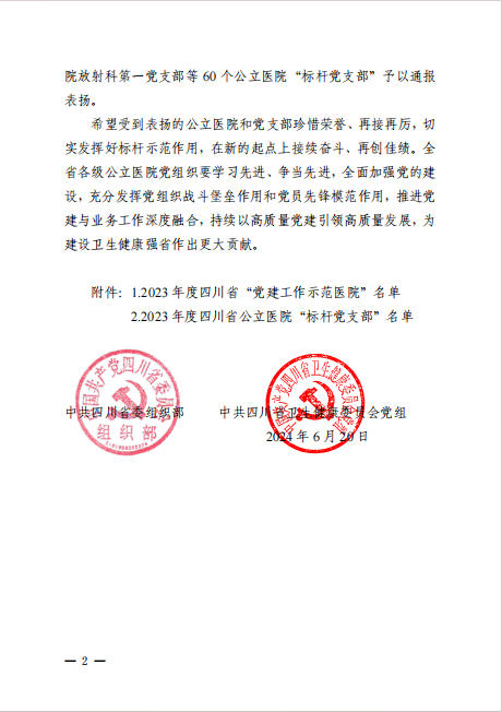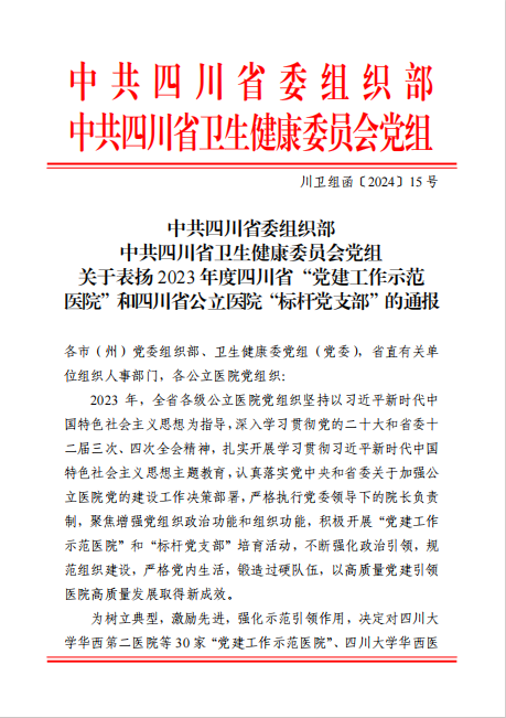 近日,中共四川省委組織部、中共四川省衛(wèi)生健康委員會黨組發(fā)文通報表揚了2023年度四川省“黨建工作示范醫(yī)院”和公立醫(yī)院“標(biāo)桿黨支部”(川衛(wèi)組函〔2024〕15號),安岳縣人民醫(yī)院榮獲2023年度四川省“黨建工作示范醫(yī)院”!