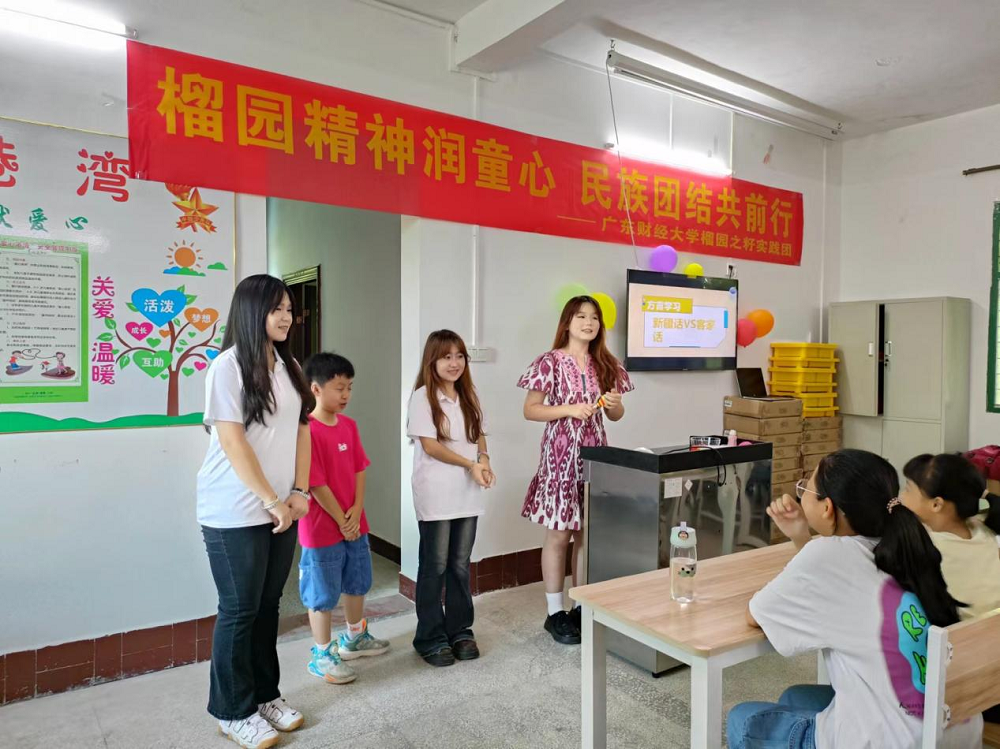 7月7日-7月13日,廣東財(cái)經(jīng)大學(xué)“榴園之籽”實(shí)踐團(tuán)組織了廣財(cái)大的各民族精英大學(xué)生到興寧市開展鄉(xiāng)村支教活動(dòng),隊(duì)員們教授民族特色歌舞、繪畫手工、武術(shù)體育和勞動(dòng)教育等內(nèi)容,助力兒童德智體美勞全面發(fā)展。隊(duì)員們還為兒童展示各民族的文化特色,讓他們感受到不同民族文化的魅力,并通過講述廣東人民援疆、援藏的事跡,特別是“榴園”校友黃海芬扎根西藏奉獻(xiàn)的事跡,引導(dǎo)孩子們鑄牢中華民族共同體意識(shí)。隊(duì)員們?cè)谥Ы讨袀鬟f“榴園精神”,鼓勵(lì)孩子們一起學(xué)習(xí)“凝心聚力、團(tuán)結(jié)奮斗”的“榴園精神”,激勵(lì)他們勤奮向?qū)W、學(xué)會(huì)感恩,長大成才后回饋家鄉(xiāng)和社會(huì)。
