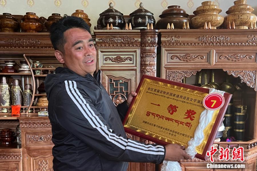 “這是我去年獲得的西藏自治區(qū)首屆農(nóng)牧民國(guó)家通用語言文字演講比賽一等獎(jiǎng),我當(dāng)時(shí)演講的主題就是民族團(tuán)結(jié)?!痹诹种ユ?zhèn)嘎拉村黨支部宣傳委員、村委會(huì)副主任尼瑪多吉家中,主人正自豪地向記者們展示著獲獎(jiǎng)牌匾。