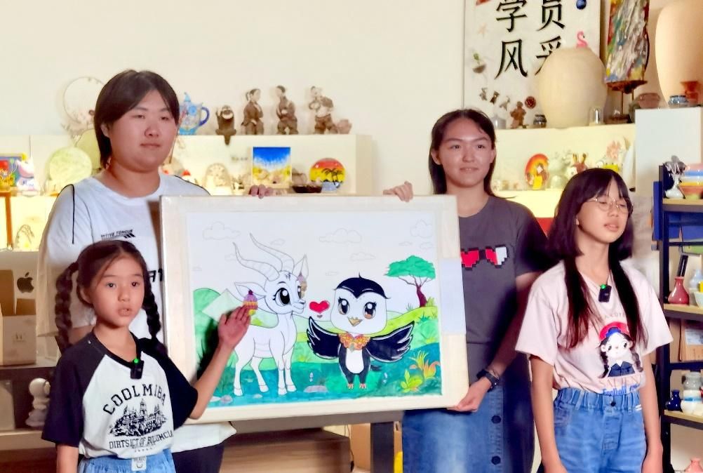活動期間,北京的劉心語、吳梓菡、文藝、吳辰希與西藏的旦增雍措、旦增尼瑪、徐杰、索朗央珍等兩地青少年代表,通過“同繪一幅畫”的方式,將西藏的藏羚羊與北京的雨燕巧妙地融合在一個畫面之中。畫作中,一邊是象征北京自由與活力的“空中旅行家”雨燕在無邊的藍(lán)天中翱翔,另一邊則是代表西藏堅韌與生機(jī)的藏羚羊在遼闊的無人區(qū)自由奔跑。盡管兩者習(xí)性迥異、棲息地不同,它們共同展現(xiàn)了自由無束的特質(zhì),寓意著京藏兩地青少年盡管生活在不同的文化環(huán)境中,卻都能追求自由和快樂的成長。正如北京的孩子們說:“我們把來自拉薩的藏羚羊和來自北京的小雨燕聚集到一起,畫在了一個畫面中??矗翰亓缪虼髦刈宥?,小雨燕身著云領(lǐng)服飾,她們是盛裝出席啊。就像我們,北京和西藏的同學(xué)們,手拉著手,心連著心,書信往來,學(xué)習(xí)探究,相互幫助,一起成長?!蔽鞑氐暮⒆诱f:“我們就像畫中的藏羚羊和北京雨燕一樣,心手相牽,互相鼓舞,用積極的態(tài)度學(xué)習(xí)、生活,成為祖國的好少年!”。