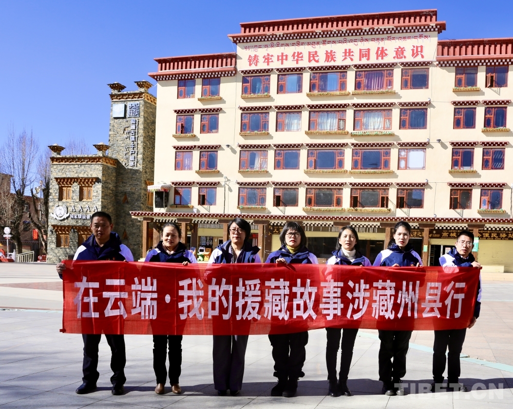 圖為宣講團(tuán)援藏干部代表在理塘縣格薩爾王廣場合影留念 攝影:龍真多吉