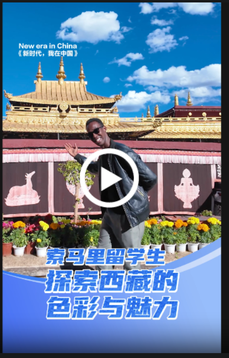在西藏的藍(lán)天白云下,索馬里留學(xué)生陽光(Musab Abdikadir)覺得這里的風(fēng)景宜人、色彩斑斕,令人心馳神往。作為中央民族大學(xué)的學(xué)生,陽光在中國已生活了八年,初次踏足西藏,他便被這片充滿新鮮感的土地和震撼心靈的美景所打動。