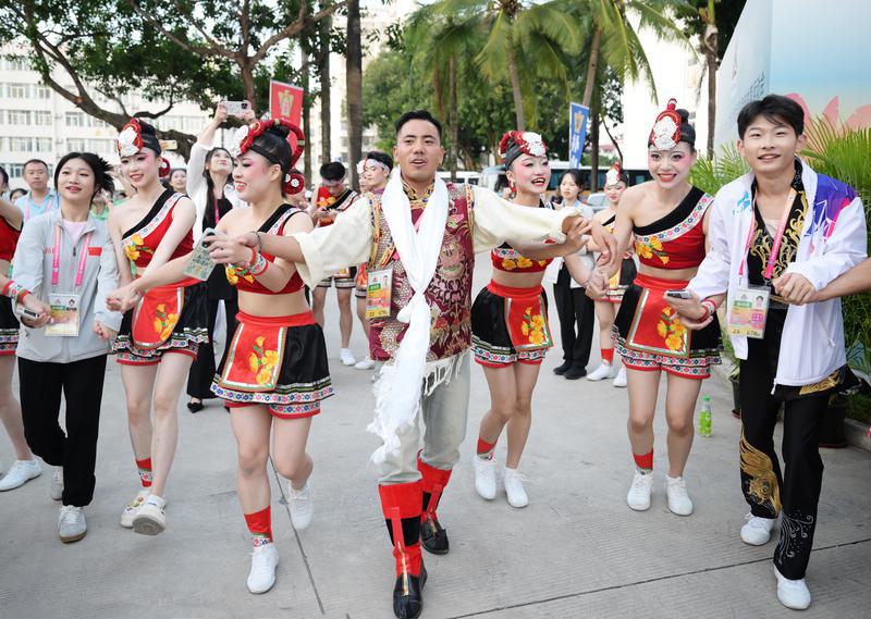 11月22日,由國家民委和國家體育總局主辦、海南省人民政府承辦的第十二屆全國少數(shù)民族傳統(tǒng)體育運(yùn)動(dòng)會在海南三亞開幕。圖為第十二屆全國少數(shù)民族傳統(tǒng)體育運(yùn)動(dòng)會西藏代表團(tuán)民族健身操運(yùn)動(dòng)員賽后與福建代表團(tuán)運(yùn)動(dòng)員一起跳鍋莊。