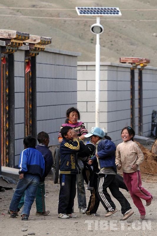 這是雙湖特別區(qū)(現(xiàn)為雙湖縣)嘎措鄉(xiāng)幾名兒童在中國石油所援建安居新房的太陽能燈柱下玩耍(唐召明2009年攝)