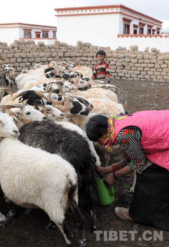 這是尼瑪縣俄久鄉(xiāng)牧民俄賽在擠羊奶。她身后是中國海油為牧民群眾所援建的安居新房(唐召明2009年攝)