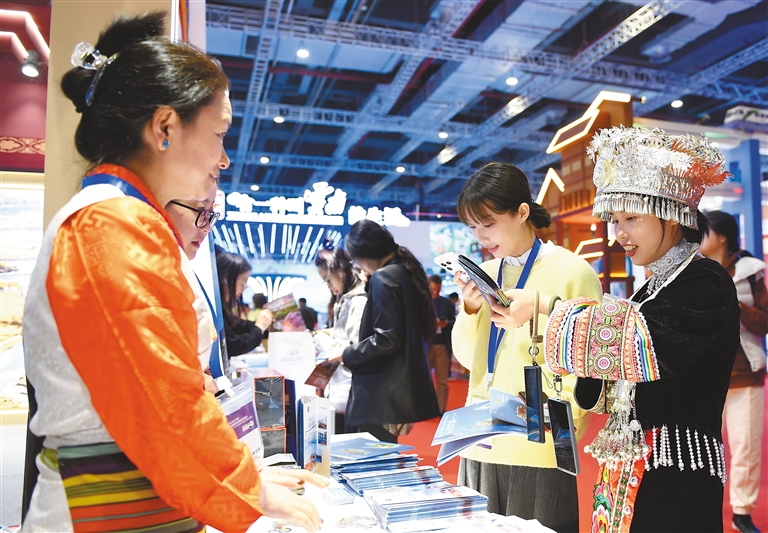 西藏展臺(tái)以“中國西藏 扎西德勒”為主題,設(shè)置文旅資源展覽區(qū)、特色產(chǎn)品展示區(qū)、非遺體驗(yàn)區(qū)以及業(yè)務(wù)對(duì)接洽談區(qū)四大展區(qū),面向國際國內(nèi)旅行商、媒體及廣大群眾全面展示西藏文化旅游資源,推介優(yōu)質(zhì)精品旅游線路、藏醫(yī)藥康養(yǎng)和非遺民俗文化等。展區(qū)內(nèi)精彩紛呈的傳統(tǒng)舞蹈、服飾表演以及非遺文化展示吸引眾多市民觀賞。
