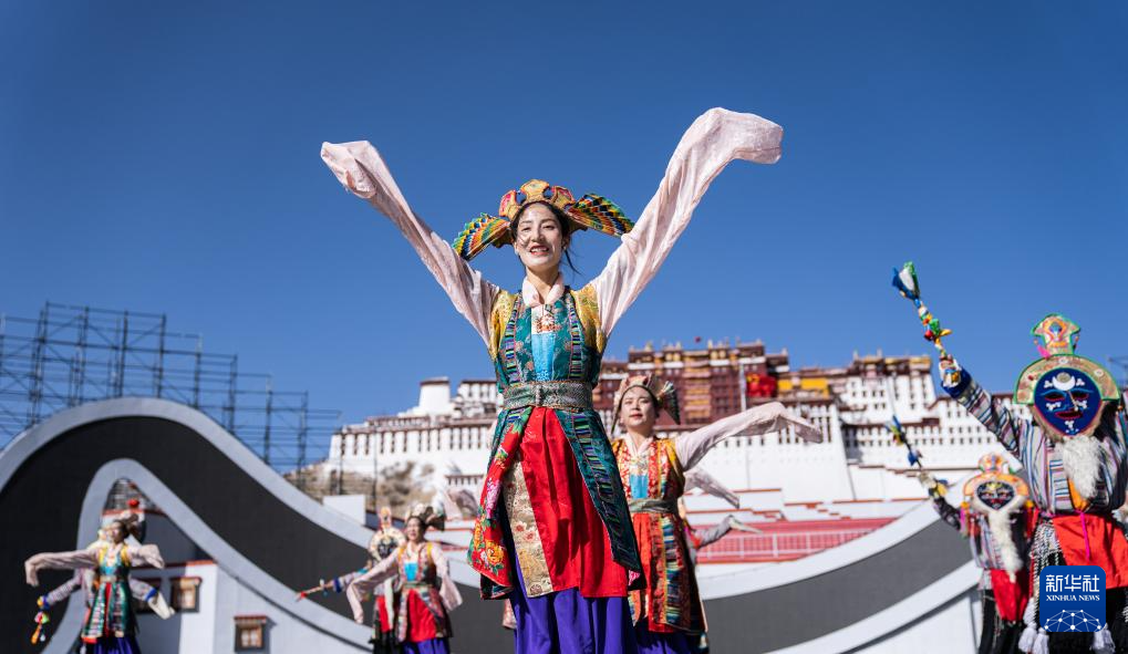 2月2日,演員在布達(dá)拉宮廣場(chǎng)演出。新華社記者 丁增尼達(dá) 攝