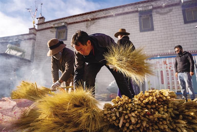 走進桑木村,房屋錯落有致,廣場上,村民們在冬日暖陽下忙碌著。有的正在煮顏料為麥穗和青稞穗上色,有的正在捆綁曬干的“羅薩梅朵”。“為了方便制作,我們根據(jù)外形給這些麥穗和青稞穗起了名字,比如這個禿禿的叫‘古日’,這個最長的叫‘扎日’,還有‘阿索’和‘梅朵’?!?4歲的村民其米卓嘎與幾位姐妹圍坐在一起,一邊捆綁“羅薩梅朵”,一邊笑著向記者介紹,手上動作絲毫未停?!昂芏嗳诉^年講究儀式感,會選擇買齊這四種,但大部分人會從中選兩種。”