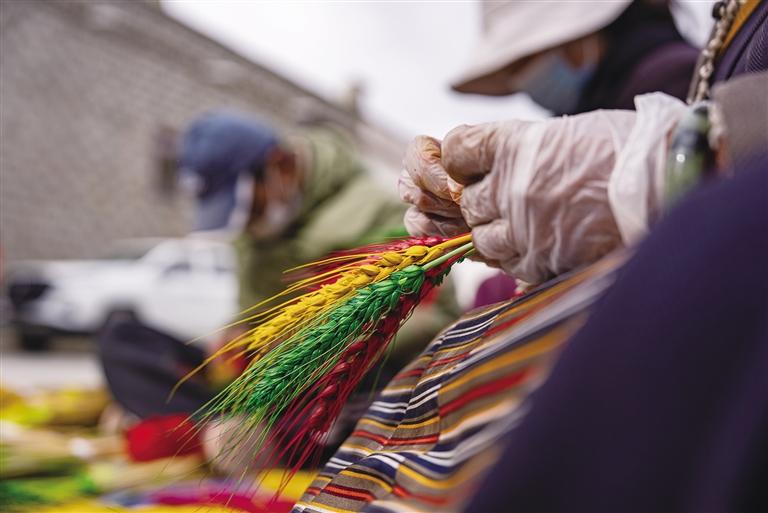 從春耕、夏耘、秋收到冬天的染色、晾干、捆綁、售賣,“羅薩梅朵”的制作過程并不簡單,種植和上色都極其辛苦。卓瑪次仁告訴記者:“每年4月,我們開始種植小麥和青稞,澆水施肥。9月收割時,我們會挑選顆粒飽滿的麥穗和青稞穗,捆綁后去皮曬干。10月,將它們收入屋中,一層層壘起來,房間最好朝陽且沒有老鼠。11月,開始采購顏料和捆扎用的毛線?!?/p>
