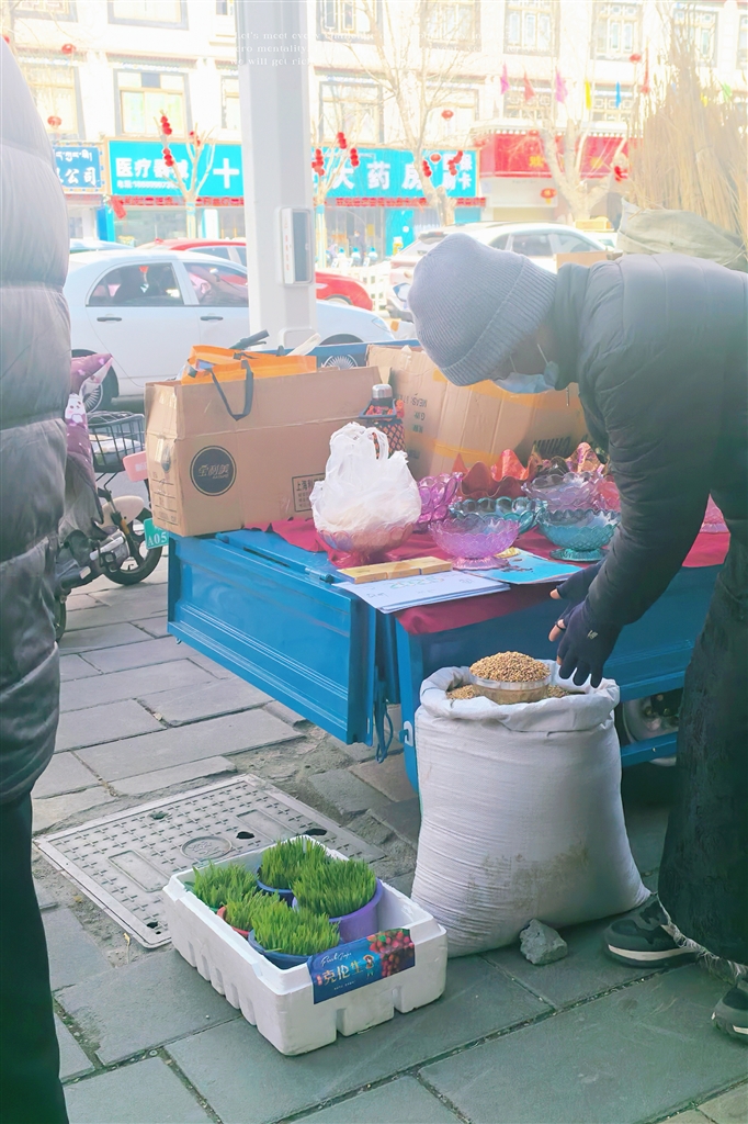 前來采購的格桑卓嘎阿姨,手里提著大包小包,臉上滿是笑意。她買了青稞酒、酥油、風(fēng)干肉還有青稞苗。新年時(shí),用青稞酒祈福,酥油茶招待客人,風(fēng)干牛肉和新鮮軟糯的拉拉、用酥油雕出精美圖案的“推”一起擺盤,供客人隨時(shí)食用?!敖衲辍磐弧汀矢隆峭惶?,打算全家圍坐一起吃。家里布置都按習(xí)俗,擺好切瑪、德卡、青稞苗,再給門窗換上新的‘香布’。孩子們買了不少藏文對(duì)聯(lián),說是要貼門上,祈福來年順?biāo)?。帶孩子來傳統(tǒng)市集,就是要讓他們記住咱們藏歷新年的習(xí)俗。這些年,市集多了些漂亮的藏式手工藝品,不過最有年味兒的,還得是這糌粑和青稞粒的香。”