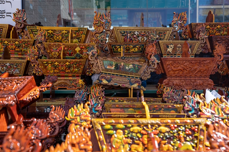 “老板,這個切瑪盒多少錢?便宜點(diǎn)我就拿走了?!薄斑@個圖案樣式都是精心雕刻的,最低1300元,實在不能再少了?!贝稳实牡赇伹?,不少顧客正在挑選“切瑪盒”,生意很是火爆?!扒鞋敽小笔菍⒕贫沸文竞杏酶舭宸珠_,左右兩邊分別盛入炒青稞和糌粑,再插上象征五谷豐登的“羅薩梅朵”和寓意吉祥的酥油花,寓意人壽年豐、吉祥如意,是藏歷新年家家戶戶必備的年貨之一。次仁告訴記者,“切瑪盒”根據(jù)圖案、顏料、大小、木材等因素,售價從幾百元到上千元不等,很多顧客普遍喜愛傳統(tǒng)樣式與圖案。
