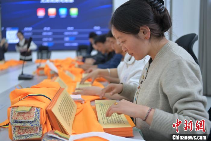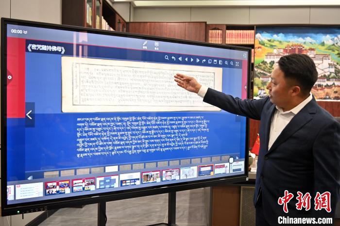 2月27日,在甘肅甘南藏族自治州碌曲縣益西達吉科技有限公司內(nèi),工作人員正在進行藏文古籍數(shù)字化相關(guān)工作。該公司主要從事民族古籍數(shù)字化建設(shè)和古籍文獻數(shù)據(jù)庫建設(shè),自2019年以來,承擔西藏、四川、甘肅等省區(qū)的藏文古籍數(shù)字化項目。圖為工作人員介紹藏文古籍數(shù)字化相關(guān)工作。中新社記者 九美旦增 攝
