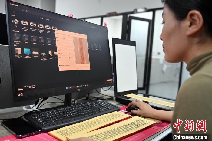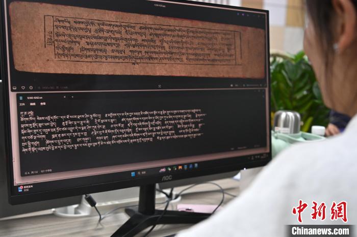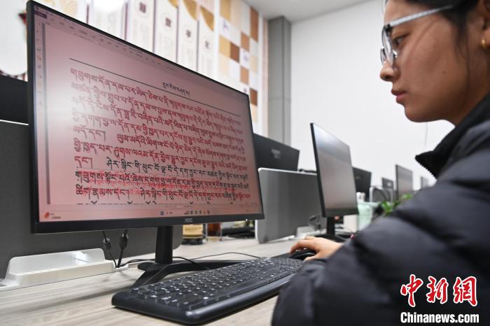 2月27日,在甘肅甘南藏族自治州碌曲縣益西達吉科技有限公司內(nèi),工作人員正在進行藏文古籍數(shù)字化相關(guān)工作。該公司主要從事民族古籍數(shù)字化建設(shè)和古籍文獻數(shù)據(jù)庫建設(shè),自2019年以來,承擔西藏、四川、甘肅等省區(qū)的藏文古籍數(shù)字化項目。圖為工作人員用該公司研發(fā)的藏文信息處理系統(tǒng)對古籍數(shù)字化內(nèi)容進行檢查。中新社記者 九美旦增 攝