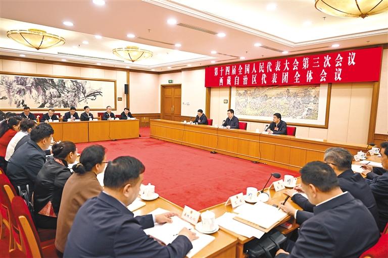 西藏代表團(tuán)團(tuán)長、自治區(qū)黨委書記王君正主持并講話。西藏代表團(tuán)副團(tuán)長、自治區(qū)黨委副書記、自治區(qū)人大常委會(huì)主任嚴(yán)金海,西藏代表團(tuán)副團(tuán)長、自治區(qū)黨委副書記、自治區(qū)主席嘎瑪澤登參加審議。