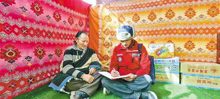 圖為改則縣先遣鄉(xiāng)那日村網(wǎng)格員扎西曲桑(右)入戶采集村民信息。(圖片由阿里地委政法委提供)