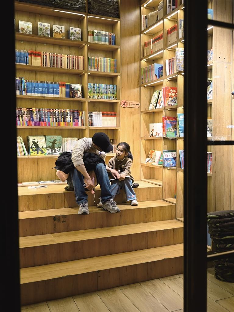 央喜書吧閱讀區(qū),讀者帶孩子一起看書。圖/記者 秦盼