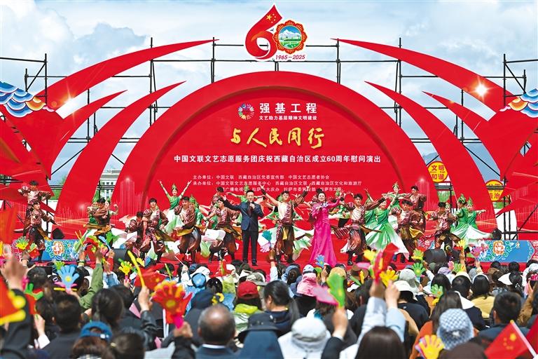 上午10時(shí)整,“與人民同行”中國(guó)文聯(lián)文藝志愿服務(wù)團(tuán)慶祝西藏自治區(qū)成立60周年慰問(wèn)演出,在歌舞《鼓舞西藏》的熱烈氛圍中正式開(kāi)場(chǎng)。