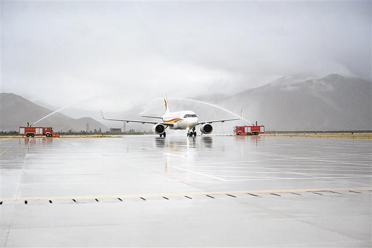 援藏入境旅游包機(jī)在日喀則和平機(jī)場過“水門”。