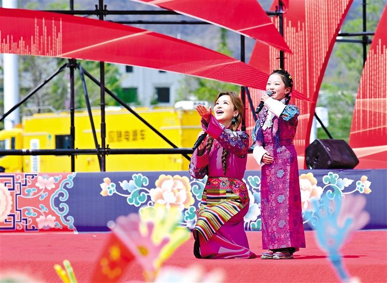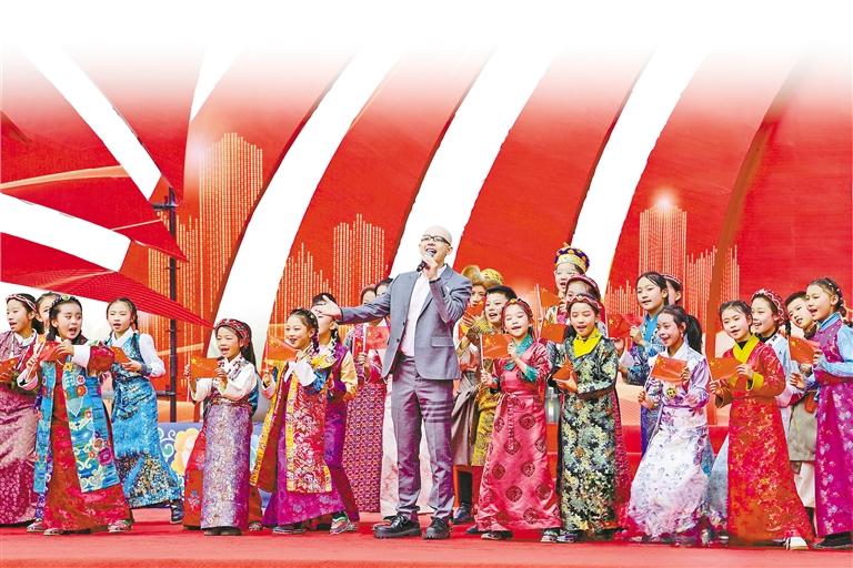 歌手平安與西藏珠峰少年合唱團(tuán)帶來歌曲《我愛你中國(guó)》。(其余圖片均由記者 唐斌 白瑪澤旺 王敏 丹增群培 旦增蘭澤 攝)