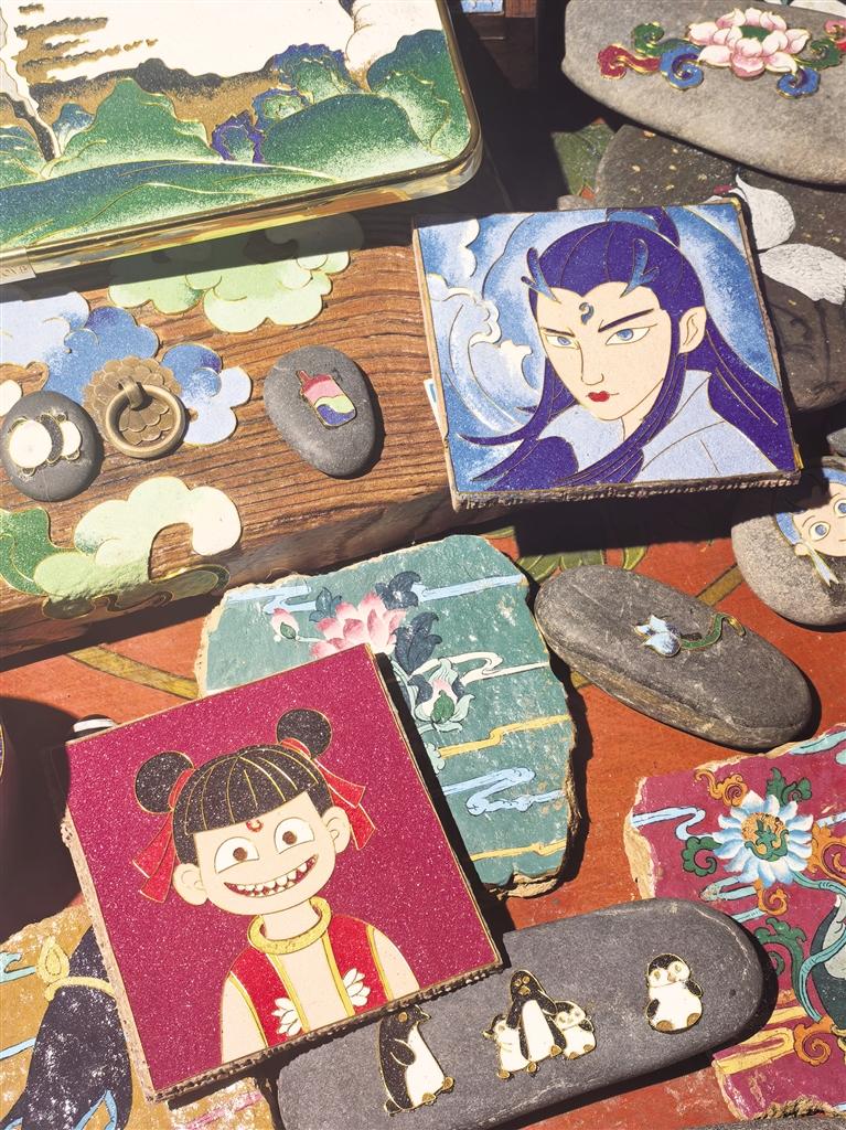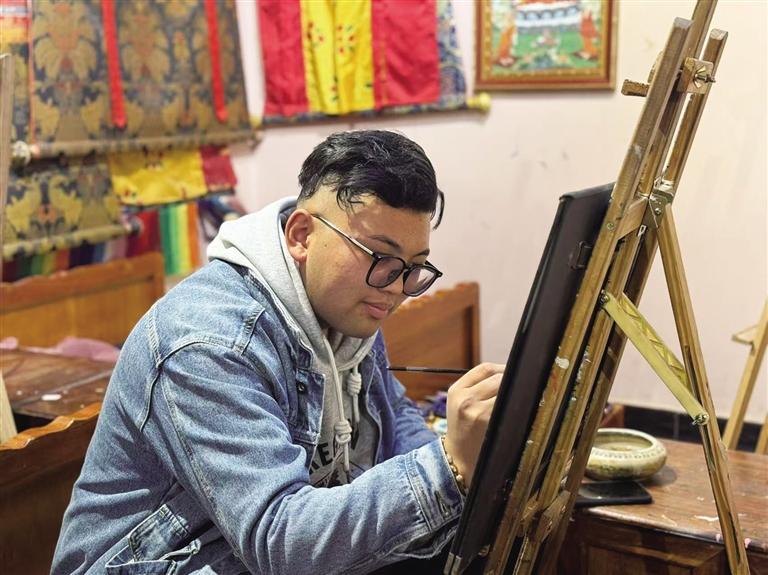 只見占地不到20平方米的小屋內(nèi),擺放著各類唐卡畫作。既有傳統(tǒng)唐卡作品,亦有動畫人物的“繪像”。描邊的金屬絲和光滑的質(zhì)感表面讓人忍不住駐足欣賞。店里陳列著巴掌大小的掐絲唐卡,金線掐絲在礦物顏料映襯下流光溢彩。畫師兼老板的南吉合多杰正在完成一份岡仁波齊的客單:“勉薩畫派的特色是線條細(xì)膩,顏色過渡自然。選好圖案后,會根據(jù)載體材質(zhì)、大?。ɡ缡^大小、木板長短等)收費(fèi)?!彼贿呎f著,一邊用特制工具將顏料注入金絲隔斷。