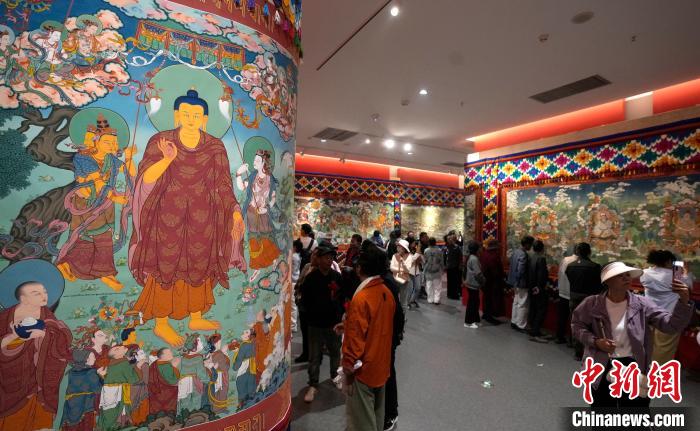 6月14日,描繪吐蕃贊普世系史的唐卡《吐蕃贊普世系大唐卡金子明鏡》在西藏博物館展出。該幅唐卡寬1.8米、長200米,由平措多布杰大師等30多位孜東唐卡畫師歷經(jīng)多年繪制完成。圖為觀眾正在欣賞展覽中的唐卡。中新社記者 李林 攝
