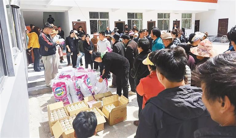 達若村村干部為村民發(fā)放清潔用品。記者 平措郎加 攝