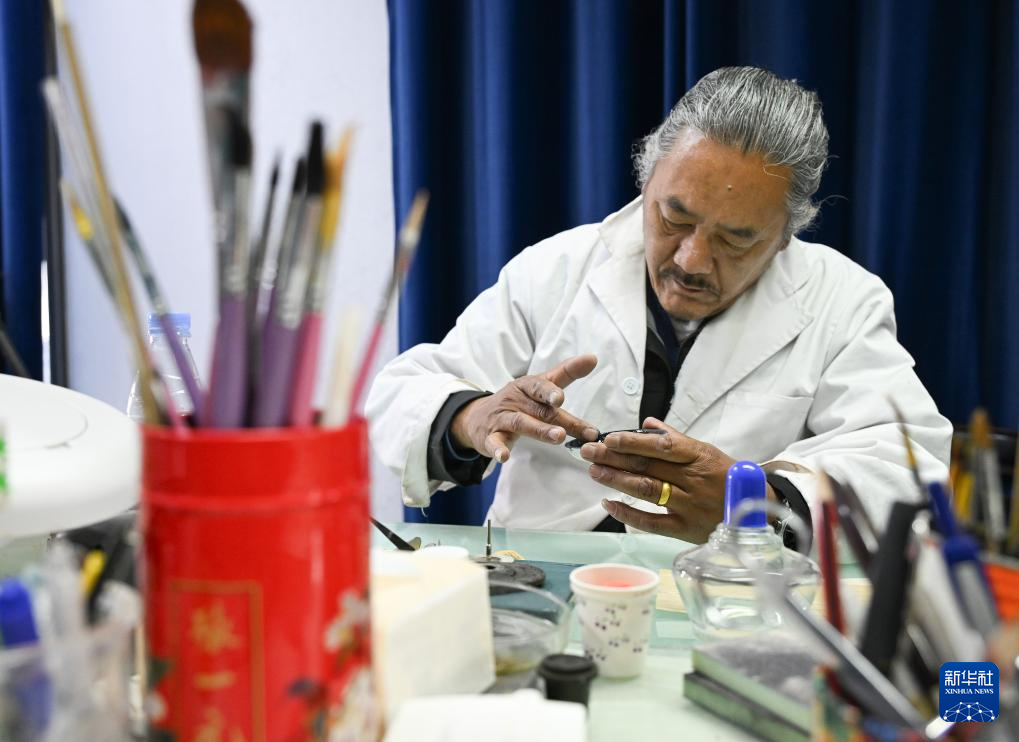 布達(dá)拉宮貝葉經(jīng)實(shí)驗(yàn)性修復(fù)小組實(shí)驗(yàn)室工作人員對(duì)用于貝葉修復(fù)的顏料進(jìn)行研磨處理(5月25日攝)。新華社記者 李賀 攝