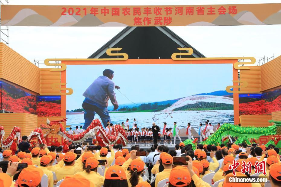 9月23日,2021中國農(nóng)民豐收節(jié)河南省主會場在焦作市武陟縣嘉應(yīng)觀啟幕?;顒蝇F(xiàn)場,隨處可見“豐收”符號,各類農(nóng)副產(chǎn)品琳瑯滿目,船上漁民捧著魚喜笑顏開。圖為河南省主會場。闞力 攝