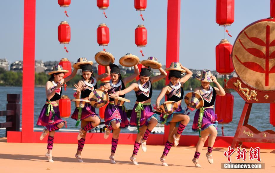 9月23日下午,2021年中國農(nóng)民豐收節(jié)浙江嘉興主場其中一項子活動,“亮絕活·樂豐收”長江水文化習(xí)俗展演活動在浙江嘉興湘家蕩月亮灣沙灘舉行。歌舞表演、非物質(zhì)文化遺產(chǎn)技藝表演、水上特技表演等特色融合節(jié)目集中亮相,精彩的演出吸引了觀看者掌聲不斷。圖為演藝人員在表演《快樂的草帽》。張茵 攝