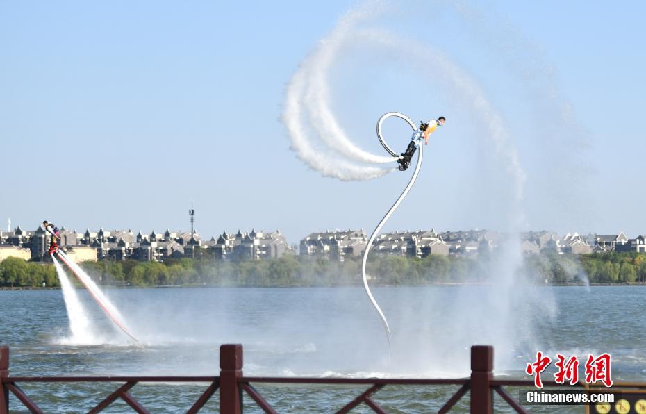 9月23日下午,2021年中國農(nóng)民豐收節(jié)浙江嘉興主場其中一項子活動,“亮絕活·樂豐收”長江水文化習(xí)俗展演活動在浙江嘉興湘家蕩月亮灣沙灘舉行。歌舞表演、非物質(zhì)文化遺產(chǎn)技藝表演、水上特技表演等特色融合節(jié)目集中亮相,精彩的演出吸引了觀看者掌聲不斷。圖為兩名演藝者在水上表演“水上特技”。張茵 攝