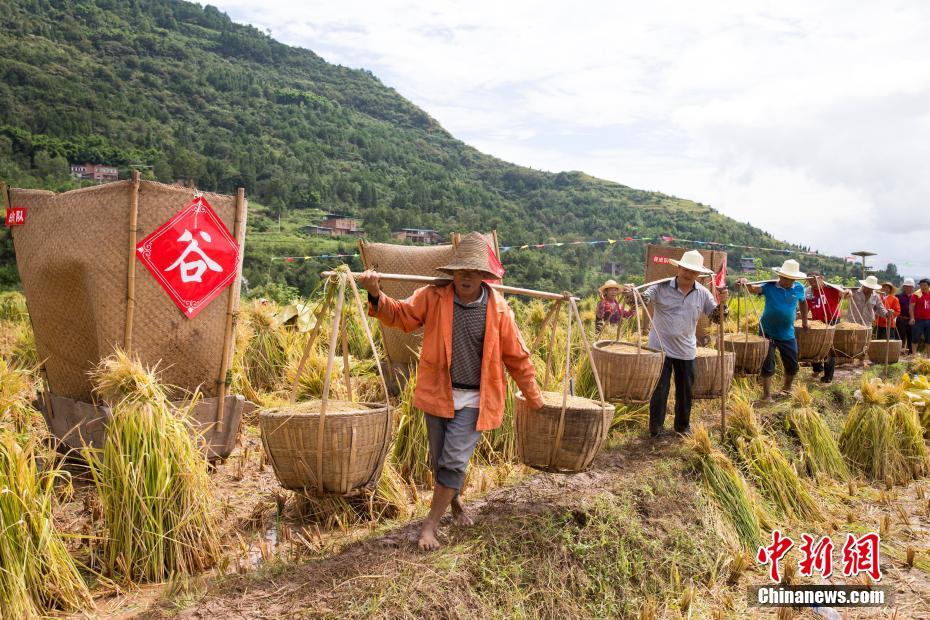 9月23日,2021年中國農(nóng)民豐收節(jié)·第一屆“天生云陽”金秋節(jié)在重慶云陽縣鳳鳴鎮(zhèn)拉開序幕。時下正是豐收的季節(jié),三峽庫區(qū)腹地重慶云陽縣的農(nóng)民門正忙著搶收搶曬,確保水稻玉米等農(nóng)作物顆粒歸倉。圖為農(nóng)民喜獲豐收。劉興敏 攝