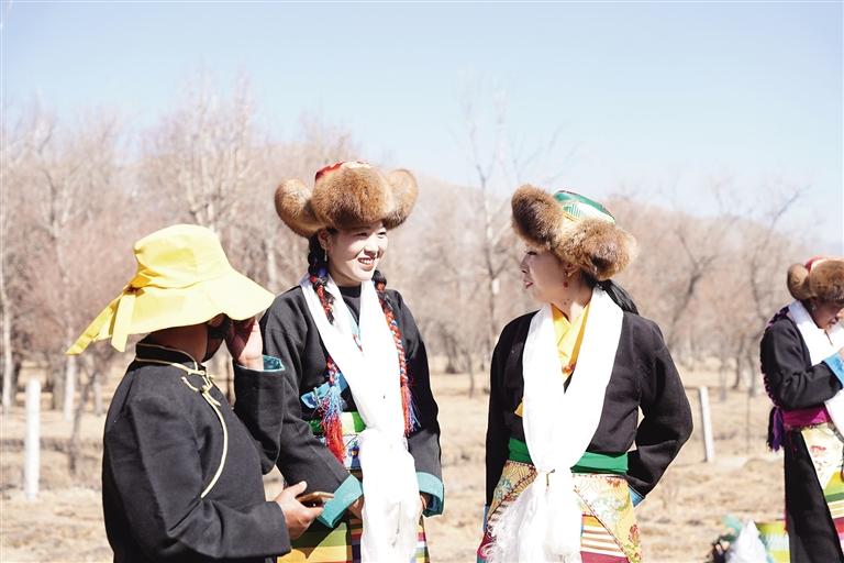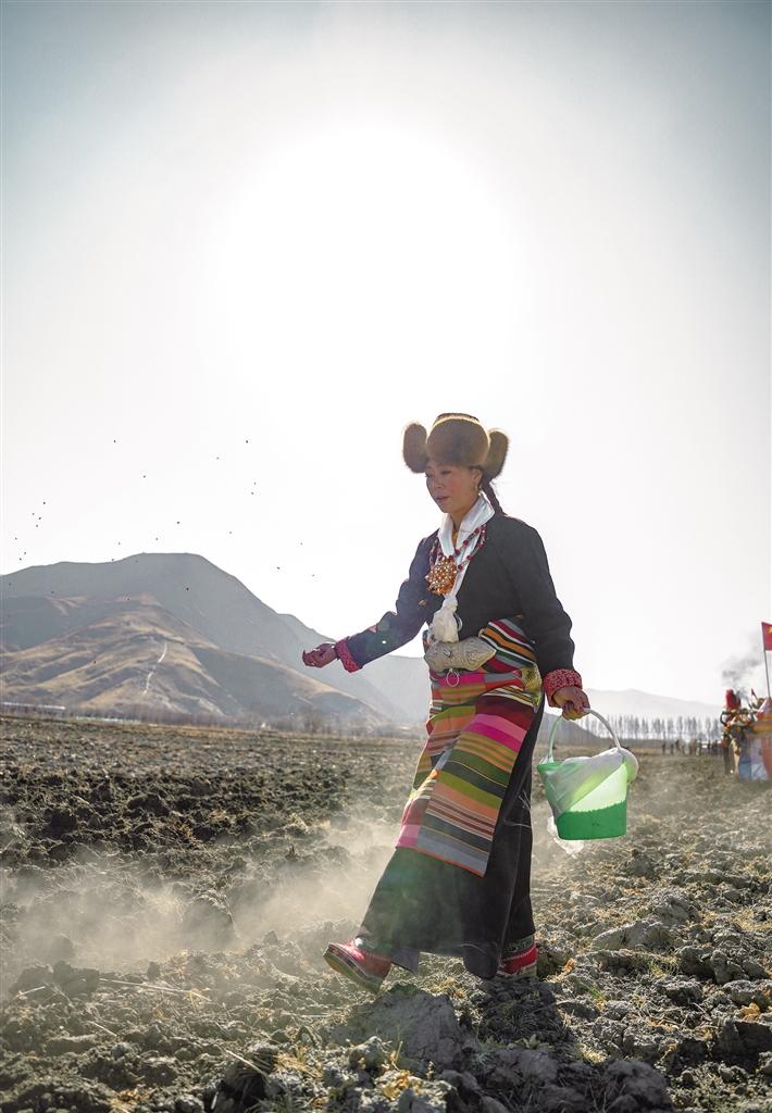 在巴嘎雪村,村民們早早地在田間等待著儀式的舉行。巴嘎雪村二組的旦巴曲桑說:“這是我第三次參加春播儀式,我們在舉行開耕儀式的前幾天,家家戶戶都要釀造青稞酒,還要給‘鐵?!瘻?zhǔn)備裝飾品。在春播儀式開始的這一天,全家人都穿上節(jié)日盛裝,并將耕牛和拖拉機(jī)也打扮得漂漂亮亮的,祈求五谷豐登。”