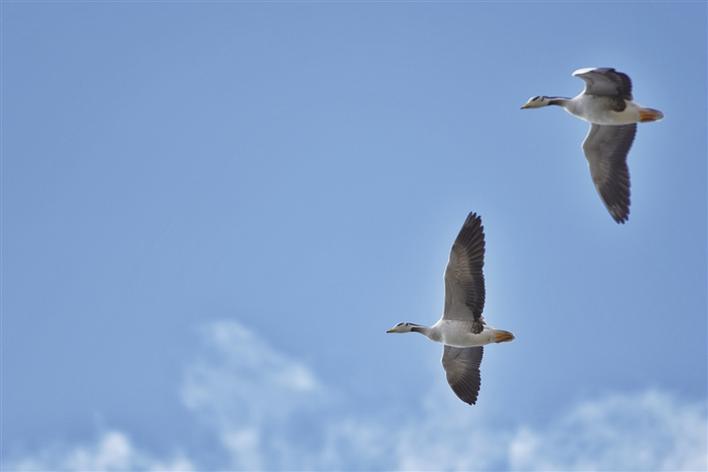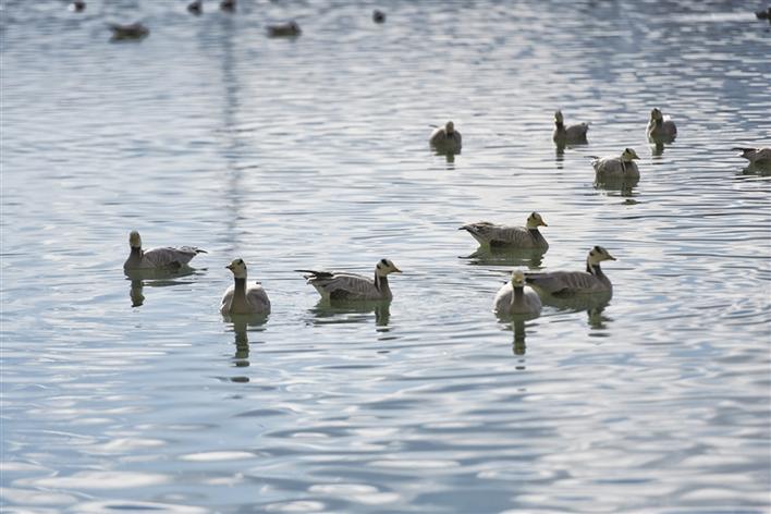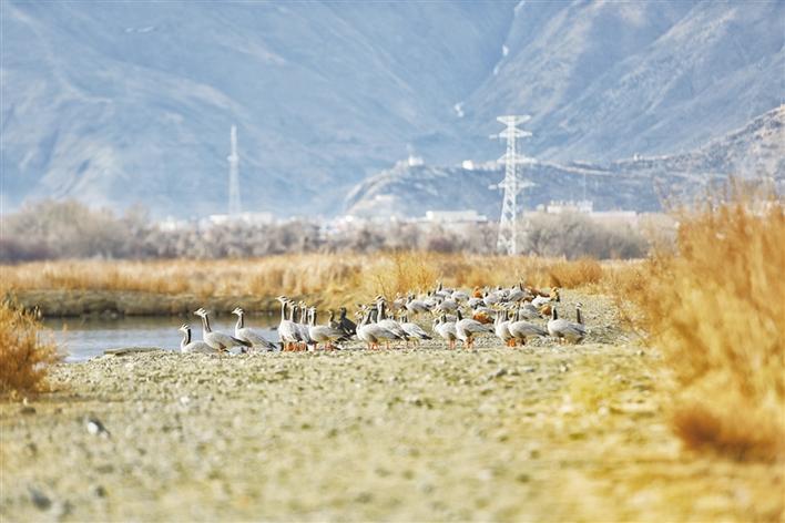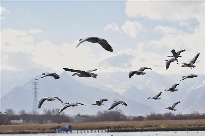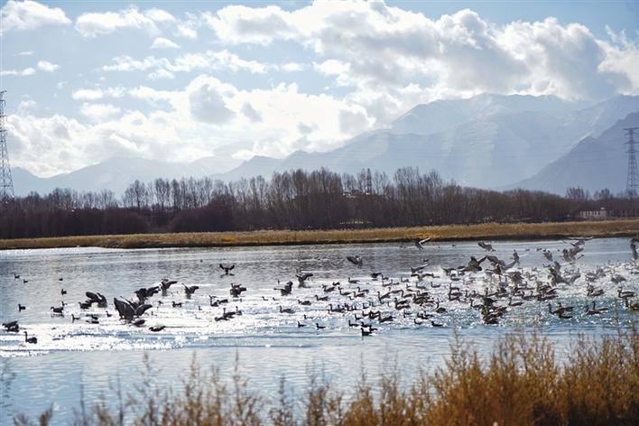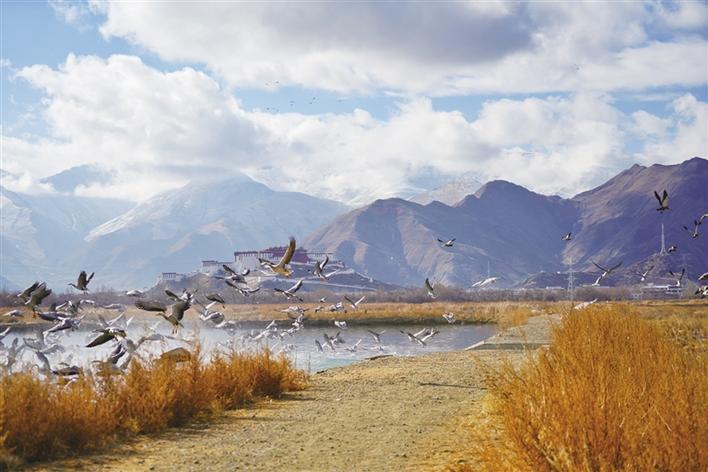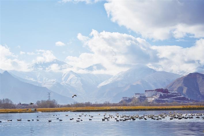 遠處,連綿起伏的山頂還覆蓋著薄薄的積雪,布達拉宮雄偉而秀美;近處,濕地內隨意顯現出的一塊塊水泊,成群的候鳥在水中玩耍嬉戲、在藍天白云下飛舞。見到可愛的飼養(yǎng)員帶來它們喜歡的麥粒,斑頭雁、紅隼、赤麻鴨、黃鴨等紛紛游上岸來,盡情地享受美食,發(fā)出歡快的叫聲。