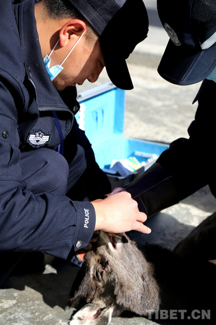 圖為丹巴森林公安民警給毛冠鹿擦傷治療